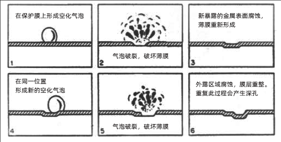實驗顯示,氣泡快速破裂可產(chǎn)生高達(dá)414MPa的沖擊波,足以使多種金屬產(chǎn)生塑性變形。以下是氣蝕的主要發(fā)生步驟: